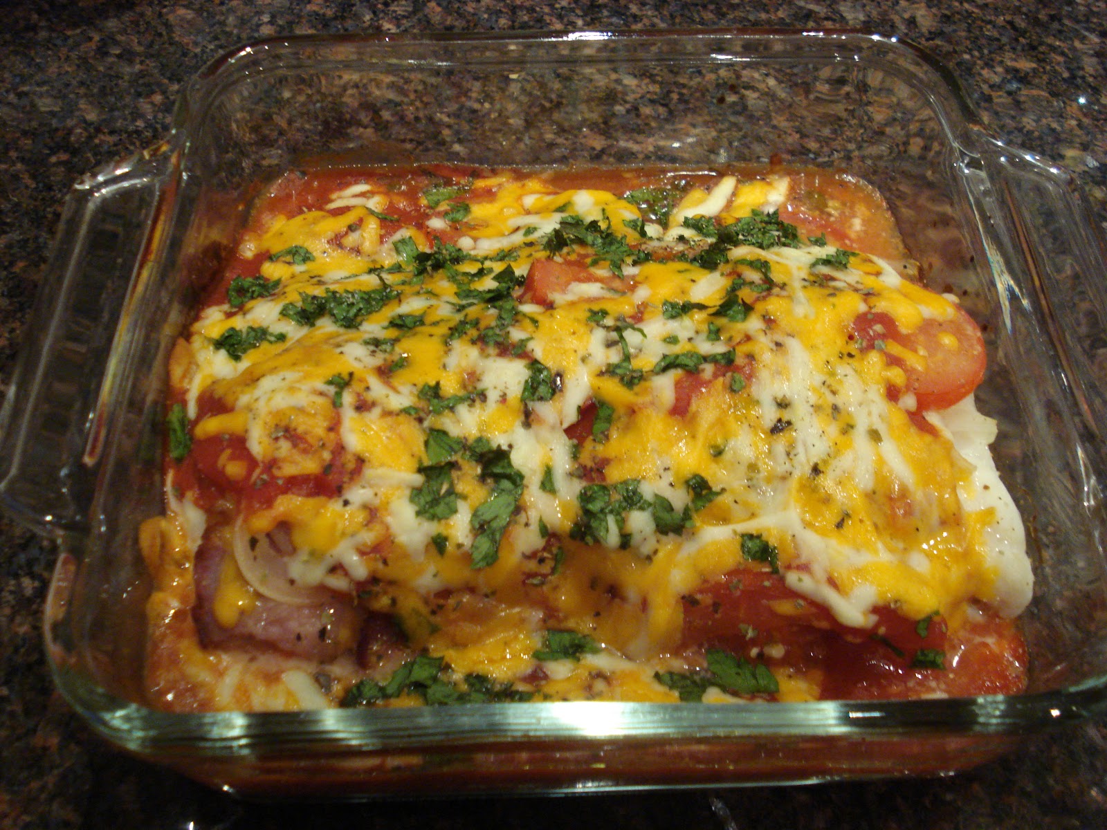 Cod=たらは味が淡白なので今回は冷凍保存してあるトマトソースにベーコン、チーズ、ハーブ類を加えてオーブンで焼くこと約40分。いつもの手抜き料理の完成です(笑)。